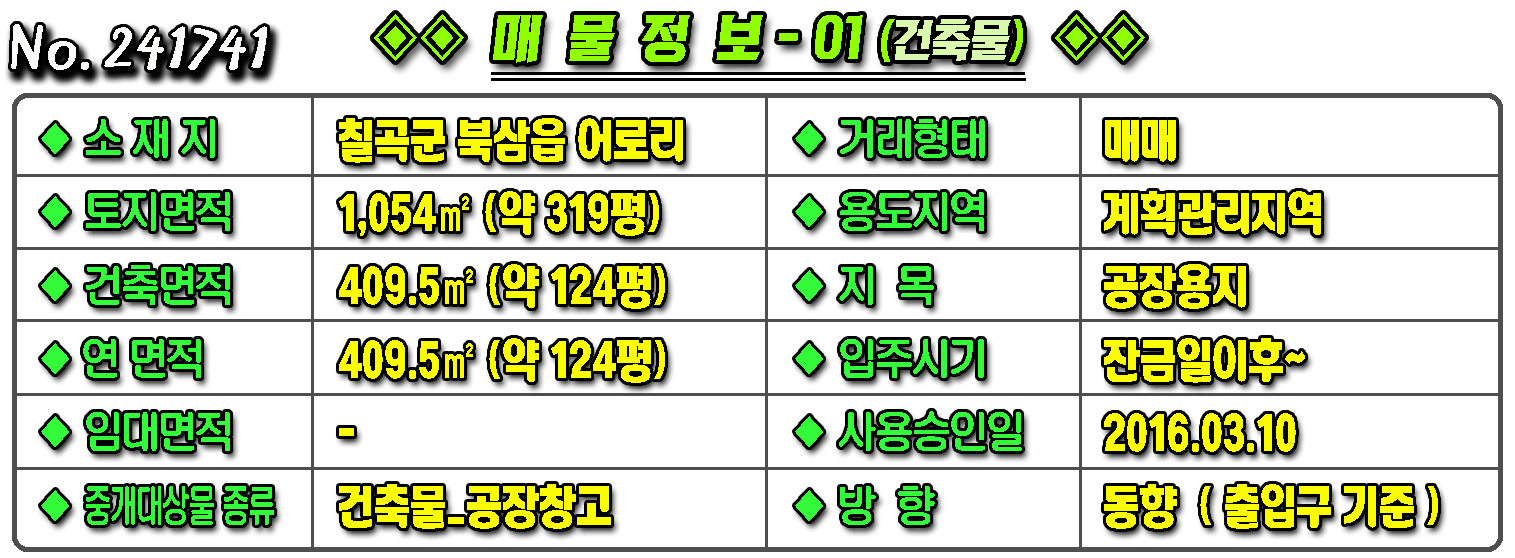 ▶ ◈ 공장창고-매매 [칠곡공장] ◈ 어로리 계획관리 다용도 소형공장매매 칠곡부동산 ◈ 토지 319평 건124평 ◈