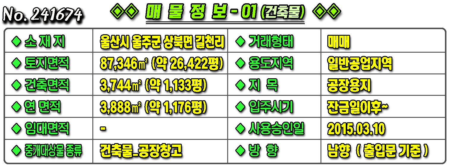 ▶ ◈ 공장창고-매매 [울산공장] ◈ 울산공장매매 상북면 길천리 일반공업지역 #공장부지 ◈ 토지 26,422평 건1,133평 ◈