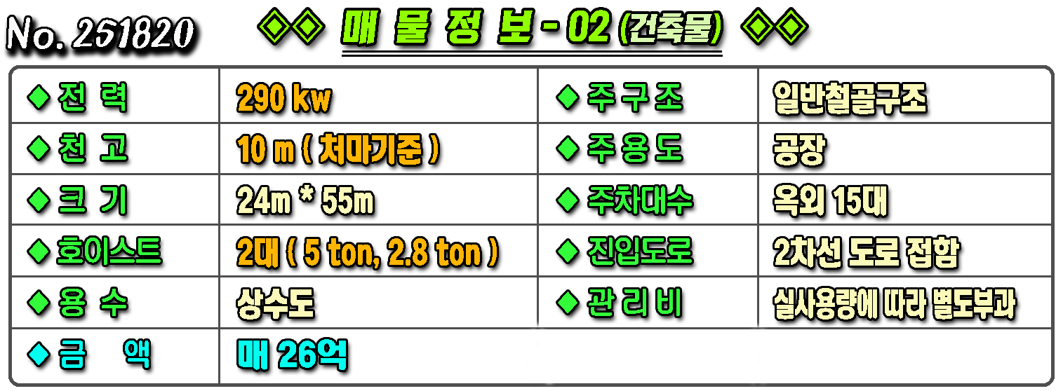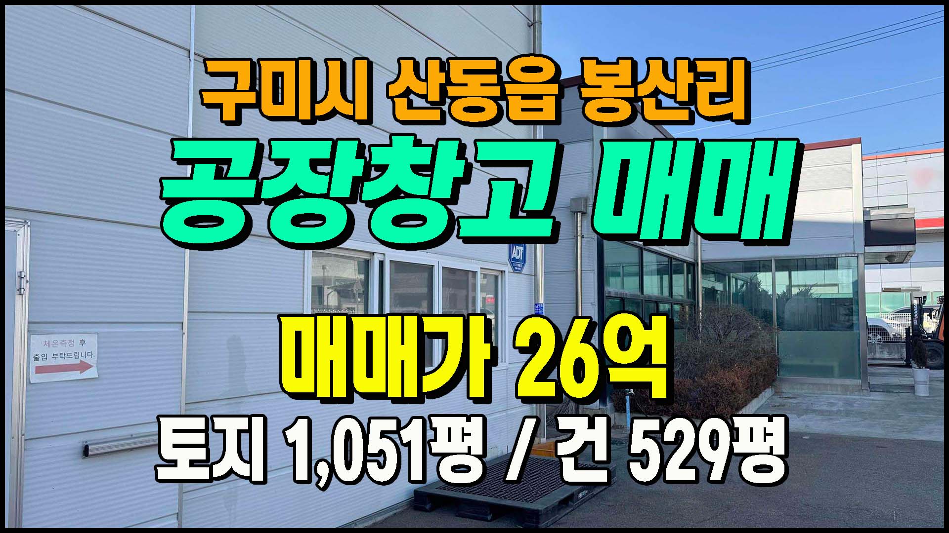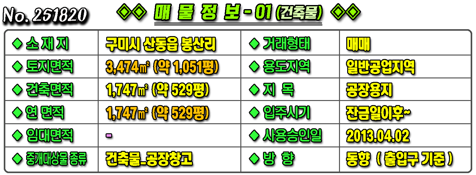 ▶ ◈ 공장창고-매매 [구미공장] ◈ 봉산리 4공단 천고10m/대형차진입 다용도공장 ◈ 토지 1,051평 건529평 ◈