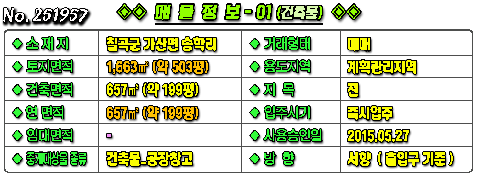 ▶ ◈ 공장창고-매매 [칠곡공장] ◈ 송학리 2차선접 다용도 단독공장매매 ◈ 토지 503평 건199평 ◈
