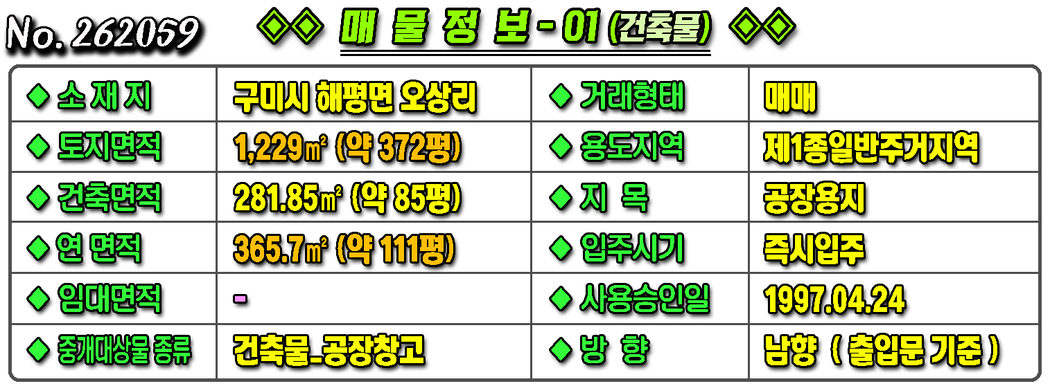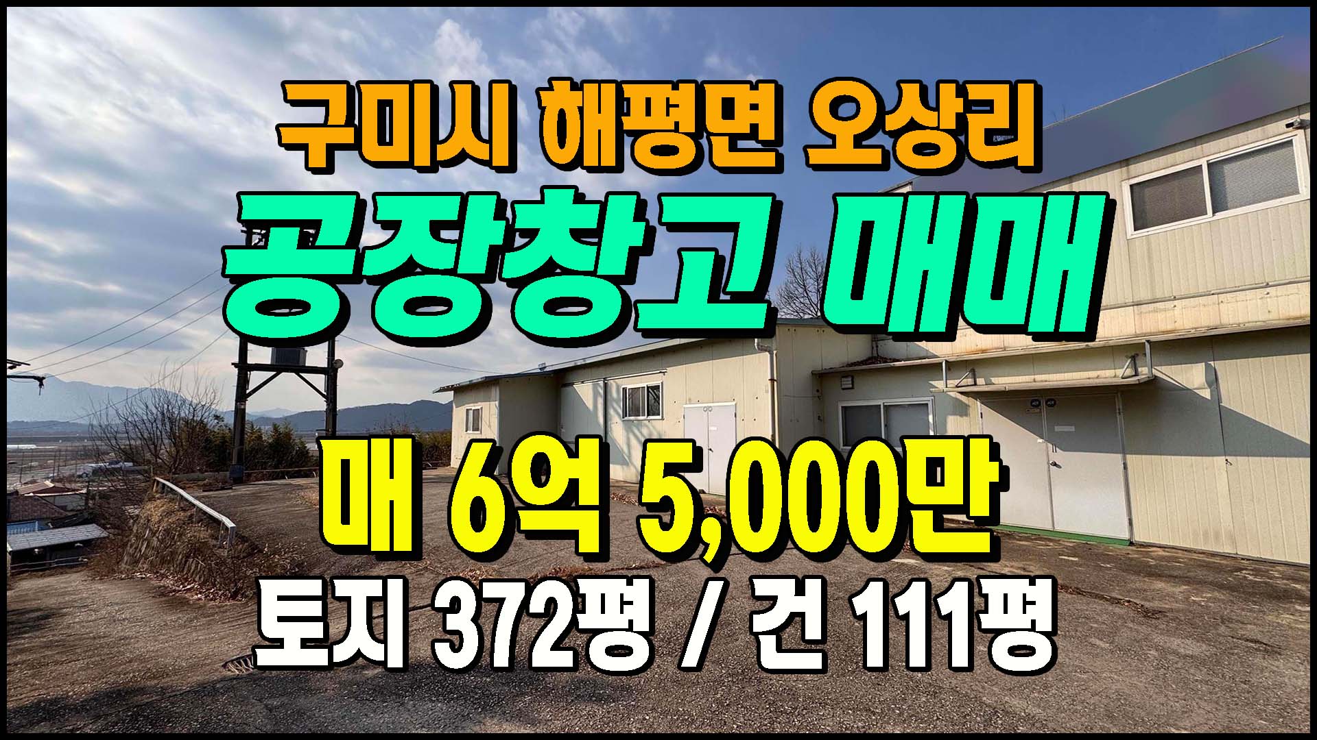 ▶ ◈ 공장창고-매매 [구미공장] ◈ 구미 5공단 인근 해평면 오상리 단독공장 매매 ◈ 토지 372평 건111평 ◈