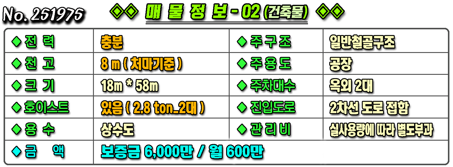 ▶ ◈ 공장창고-임대 [구미공장] ◈ 1공단 2차선접 호이스트2대 천고8m 상태좋음 공장임대 ◈ 보6,000만 월600만 ◈