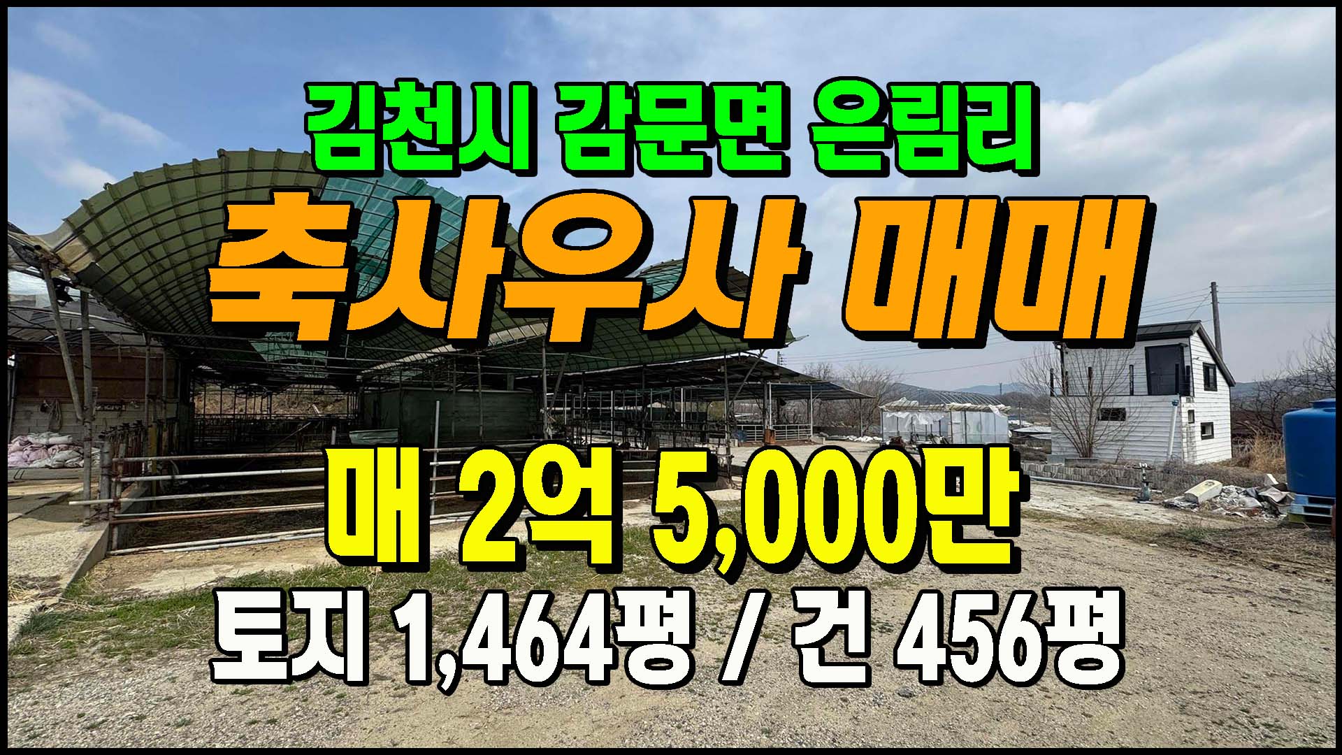 특 징 ▶ 2차선도로접한 축사(우사)매매. 현재 비워져있음. 총3동+관리사(무허가).