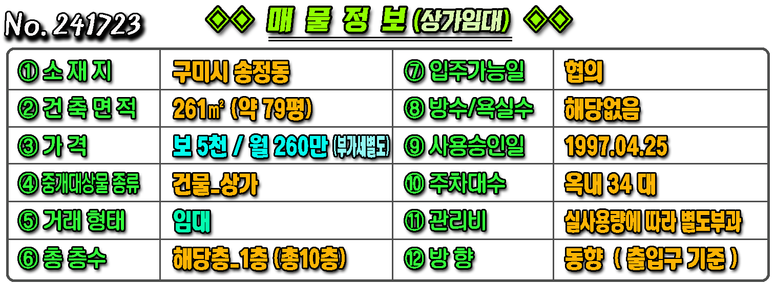 특 징 ▶ 현 성업중. 구미시청 인근 4차선대로변 코너접함_간판효과/입지최상!!