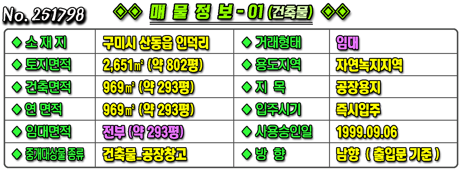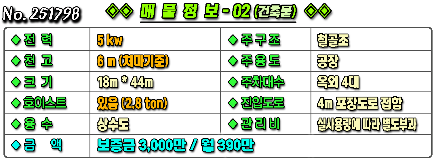 매물번호 251798 매물구분 ◈ 공장창고-임대