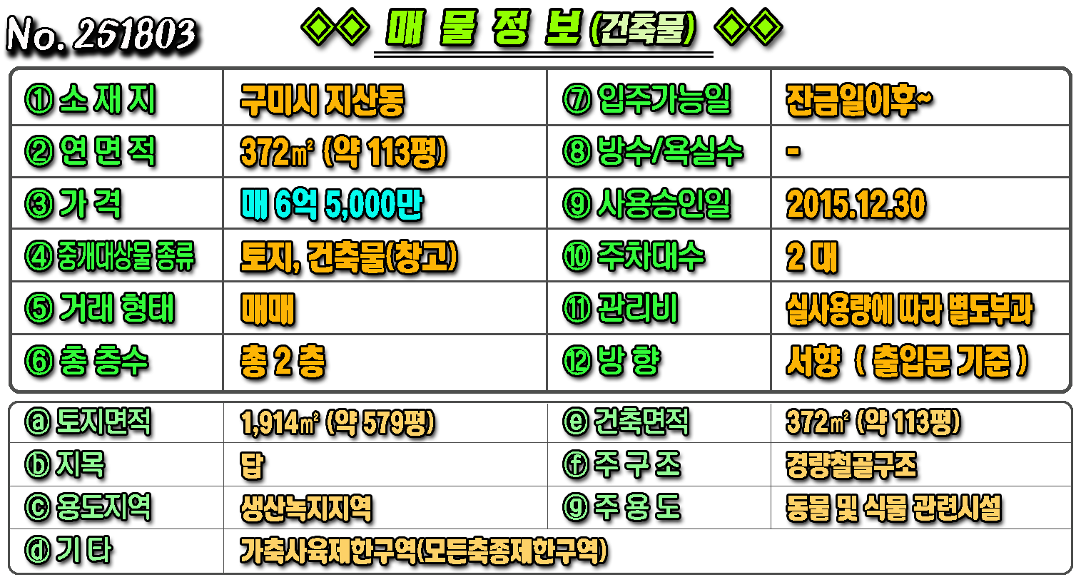 매물번호 251803 매물구분 ◈ 공장창고-매매