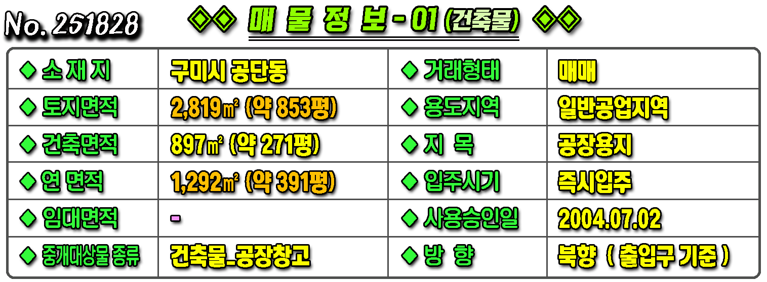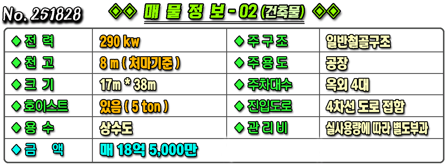 매물번호 251828 매물구분 ◈ 공장창고-매매