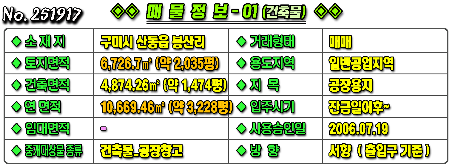제목 [구미공장] ◈ 4공단 일반공업지역 깔끔한 공장매매 ◈ 토지 2,035평 건3,228평 ◈