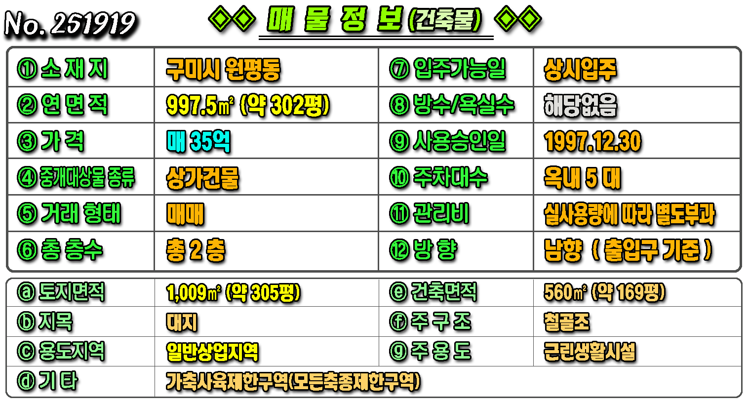 제목 [구미상가] ◈ 원평동 일반상업지역 대형식당/병원 추천 ◈ 토지 305평 건302평 ◈