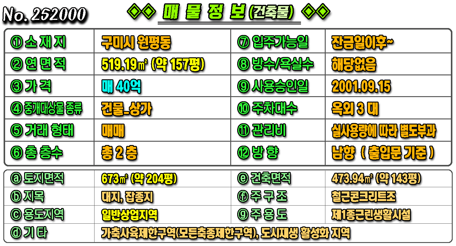 제목 [구미상가] ◈ 원평동 중앙시장 일방상업지역 투자용 건물매매 ◈ 토지 204평 건157평 ◈